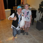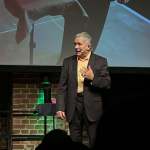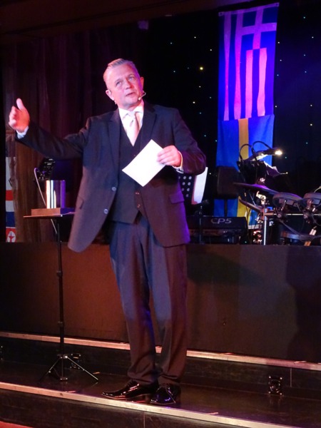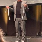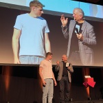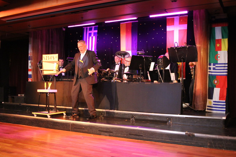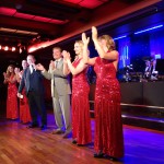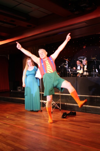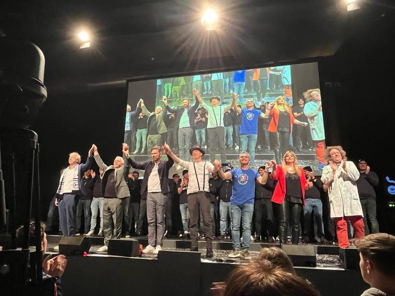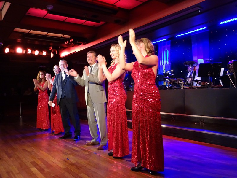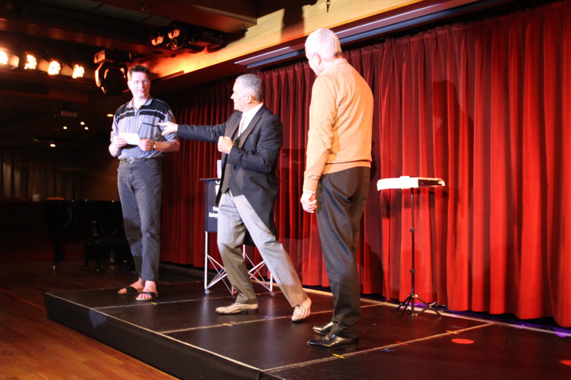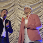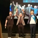 Zweite Reihe: Konrad Stöckel mit Frank, FinaleComedy Schuppen 2024, Ingo Nommsen mit Frank und Ingolf Lück mit Frank beim Tanzen.